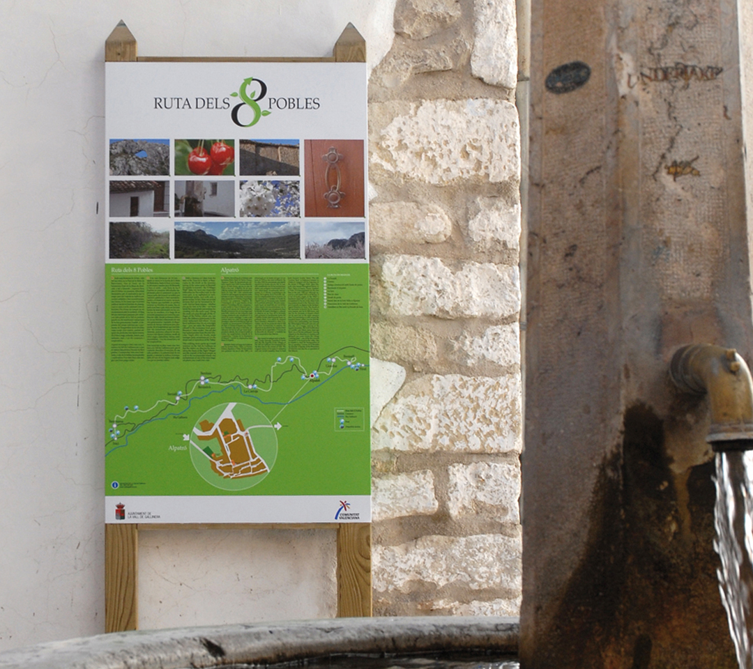 I completed my first professional internship at Efectiva S.L., a design studio with offices in Valencia. During the year I spent with them, I worked on various projects, but undoubtedly the most interesting and comprehensive one was «La Ruta dels 8 Pobles» for Turisme de la Comunitat Valenciana. They entrusted me with creating the project’s brand, and I also developed some of the signage elements and maps.
